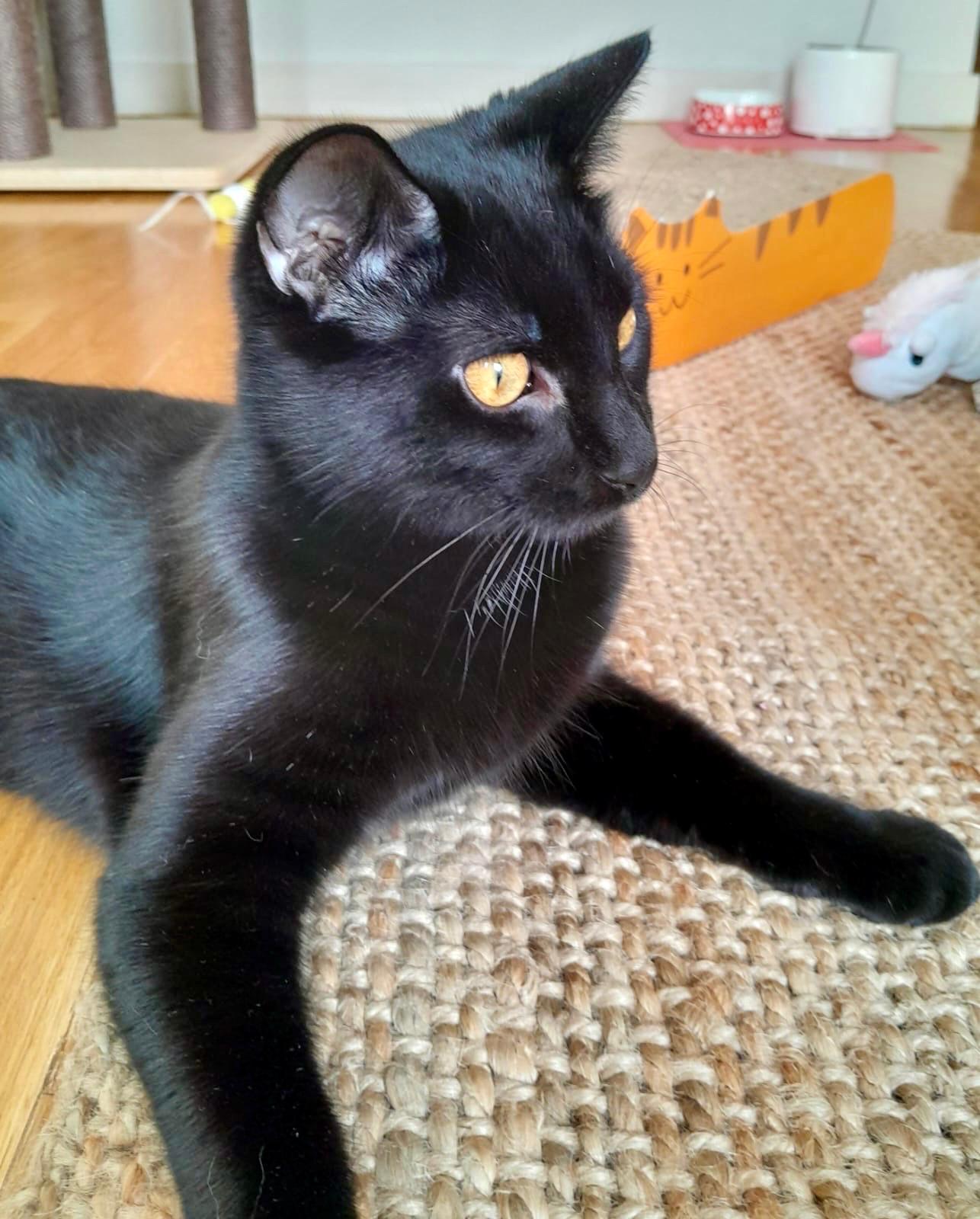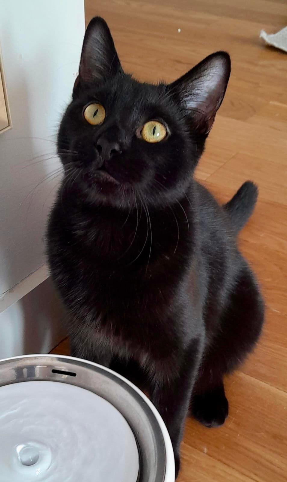 A Bosco le encanta la comida húmeda, y con otros gatos se siente en su zona de confort, llevándose fenomenal con ellos. Ya está castrado y es una verdadera «panterita» estilizada y guapa, con ese pelaje negro brillante que le da un aire de elegancia única.
