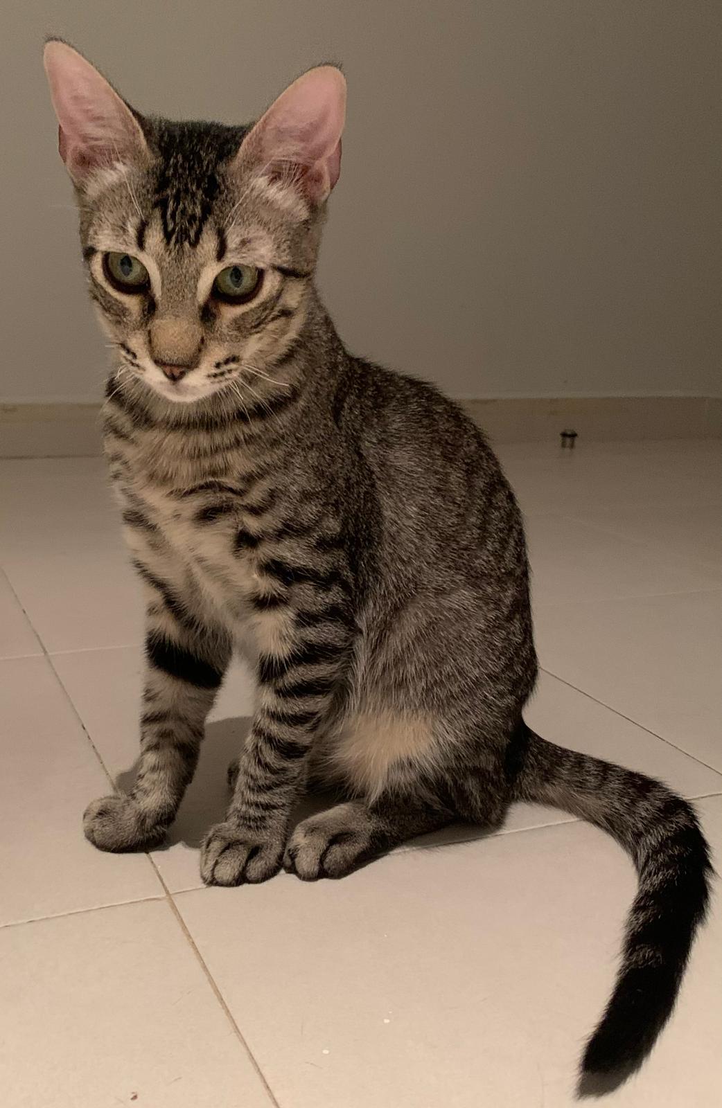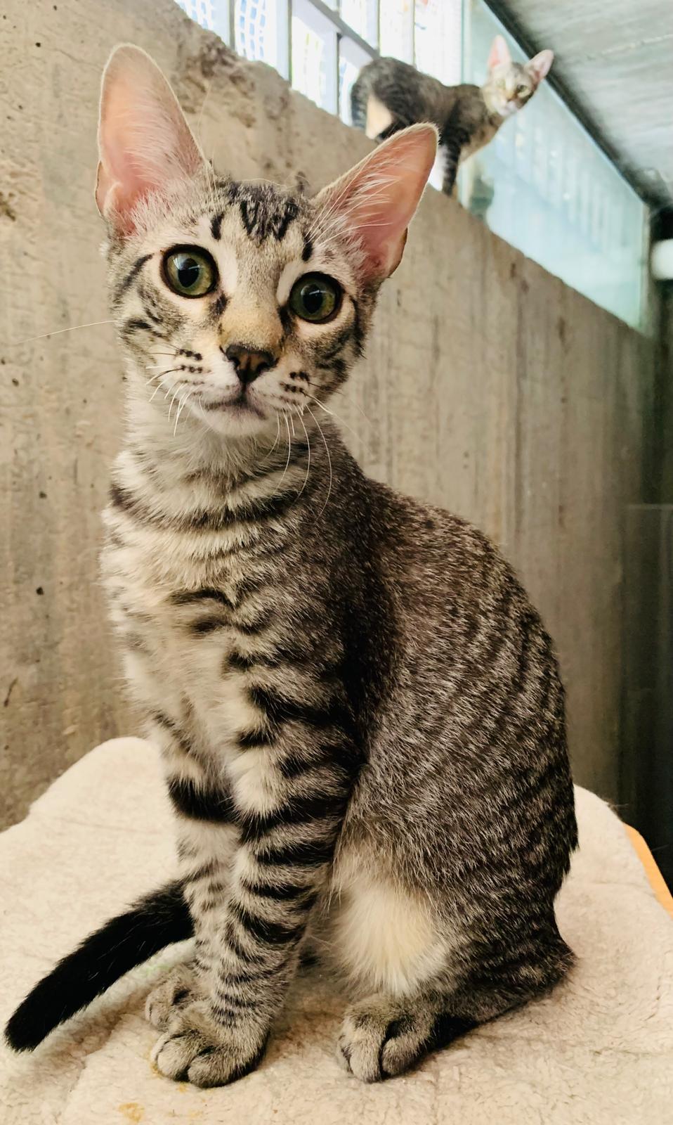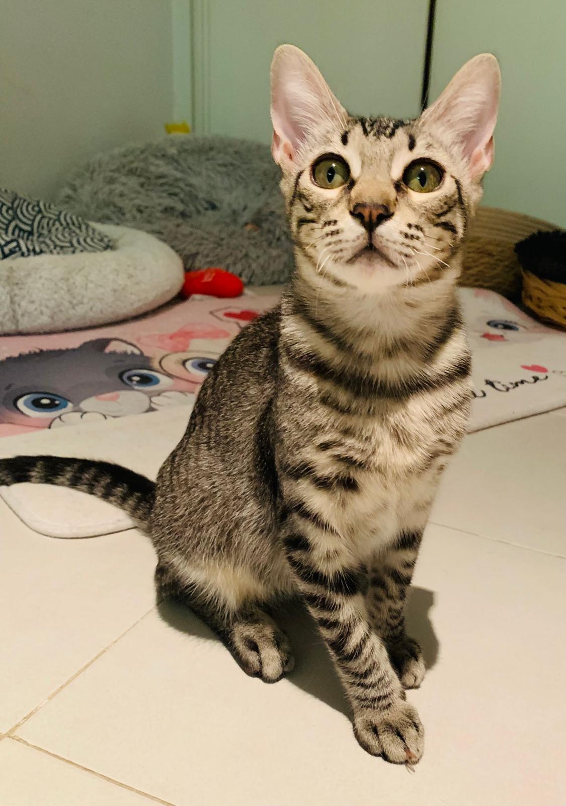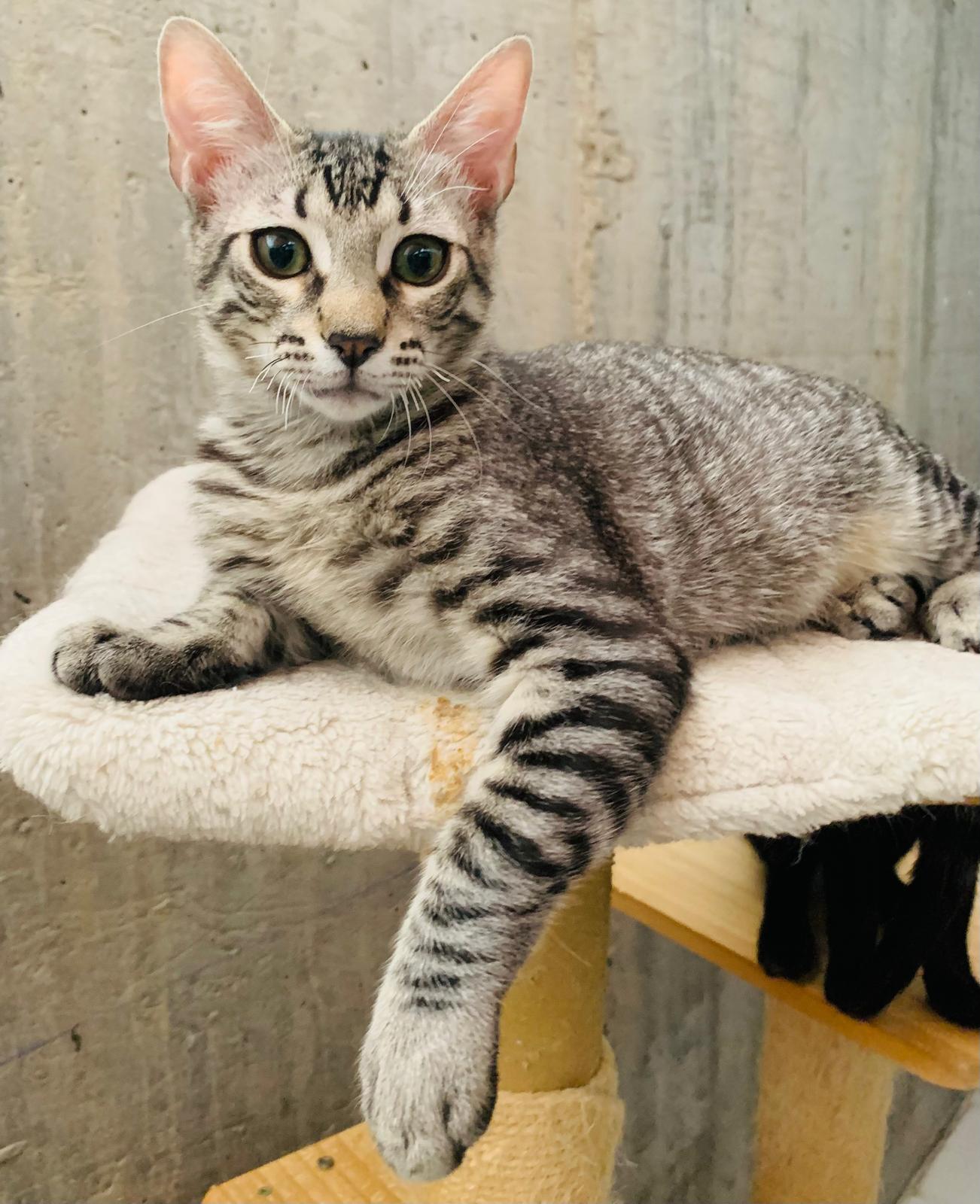 Kiran llegó junto a su madre Lotus y sus hermanitos: Tao, Ayla y Sienna desde Ceuta, después de ser rescatado de una situación difícil. Es un gatito inteligente, con patitas completamente cubiertas de rayitas finas, una mirada curiosa que nunca deja de observar y una energía sutil que lo hace encantador. Como sus hermanos, es activo, sociable y se mezcla bien con otros gatos, aunque cada día va mostrando con más claridad su forma de ser.