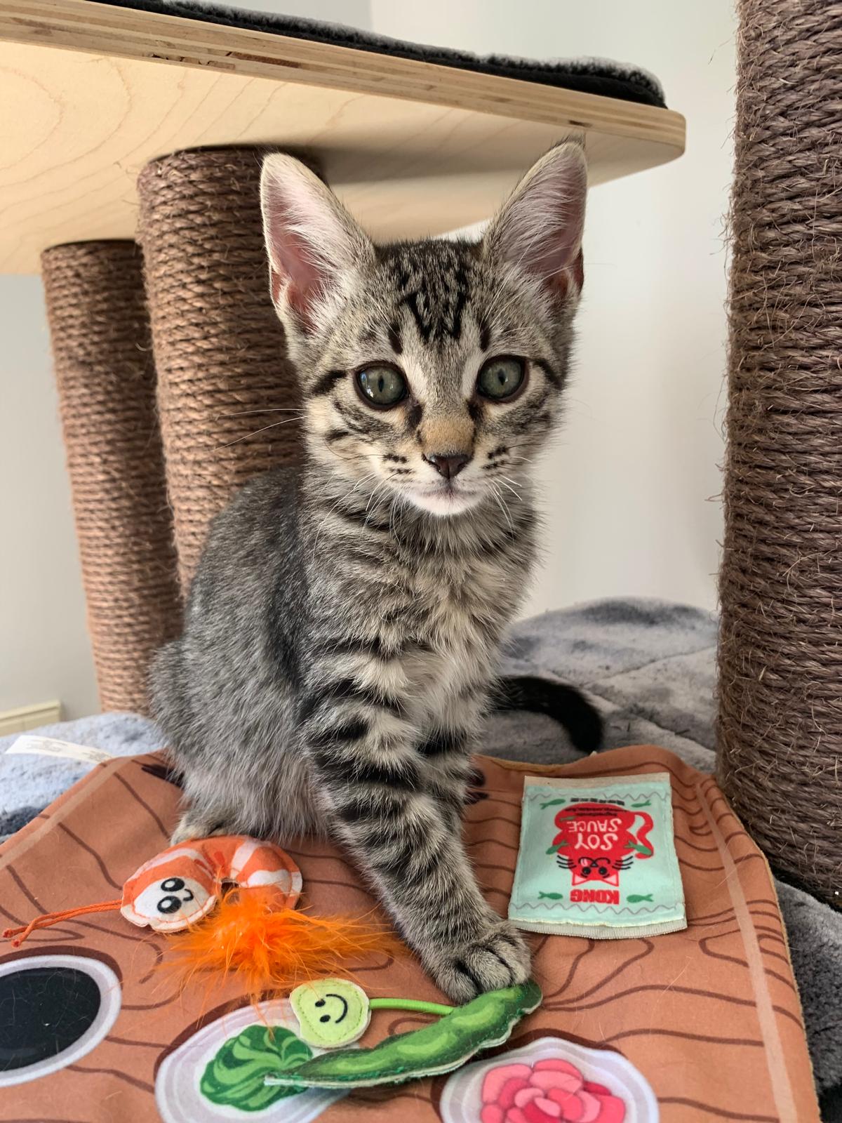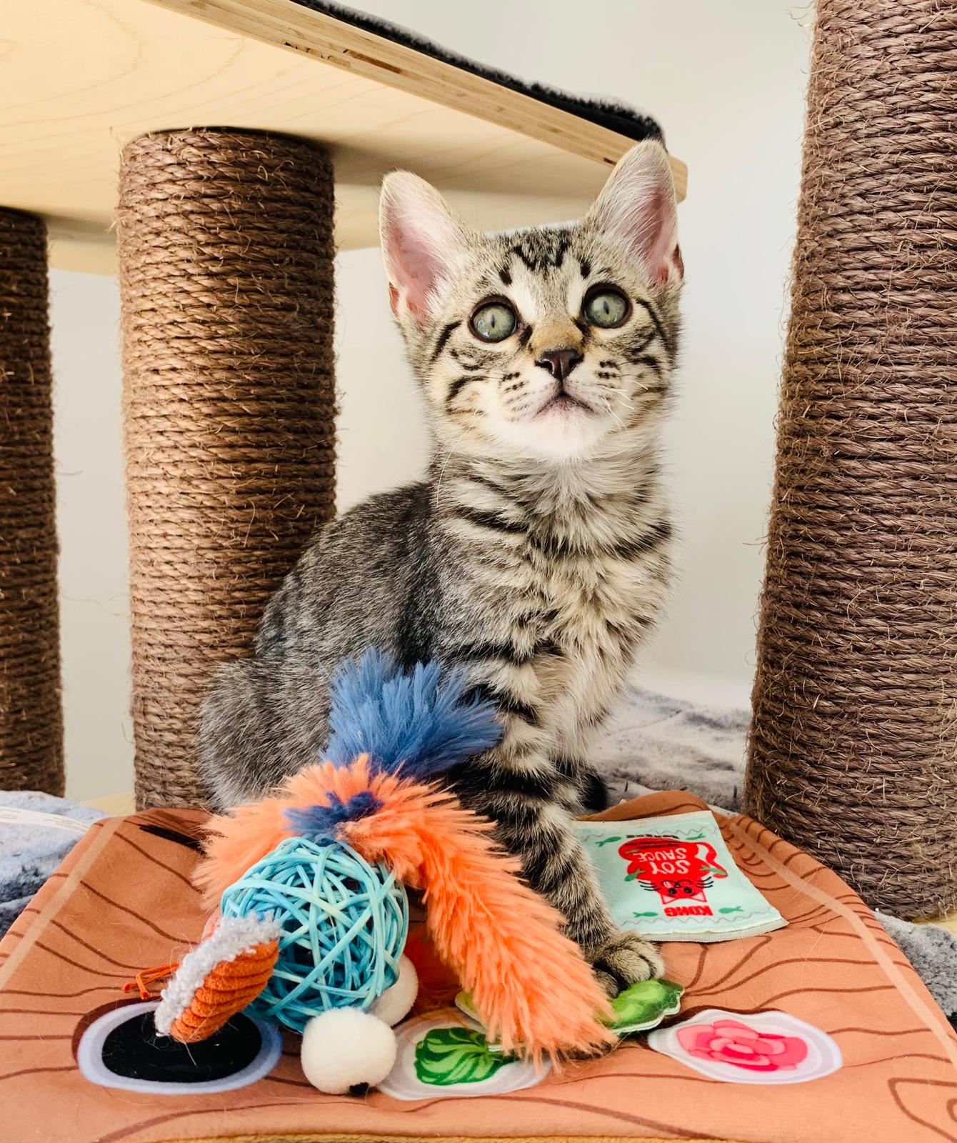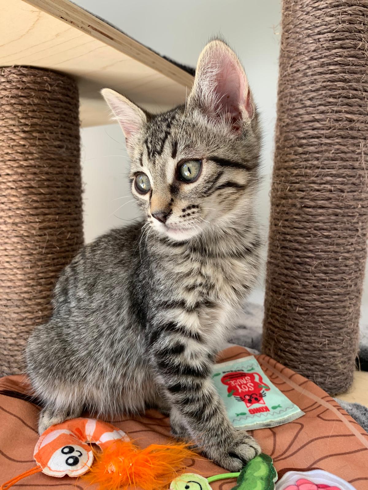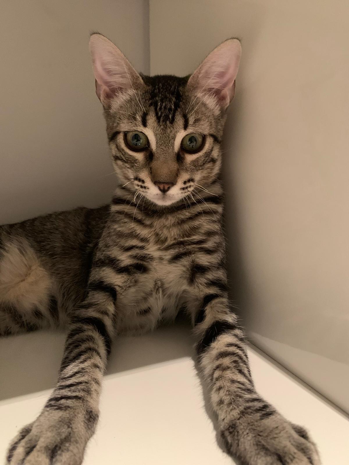 Kiran llegó junto a su madre Lotus y sus hermanitos: Tao, Ayla y Sienna desde Ceuta, después de ser rescatado de una situación difícil. Es un gatito inteligente, con patitas completamente cubiertas de rayitas finas, una mirada curiosa que nunca deja de observar y una energía sutil que lo hace encantador. Como sus hermanos, es activo, sociable y se mezcla bien con otros gatos, aunque cada día va mostrando con más claridad su forma de ser.