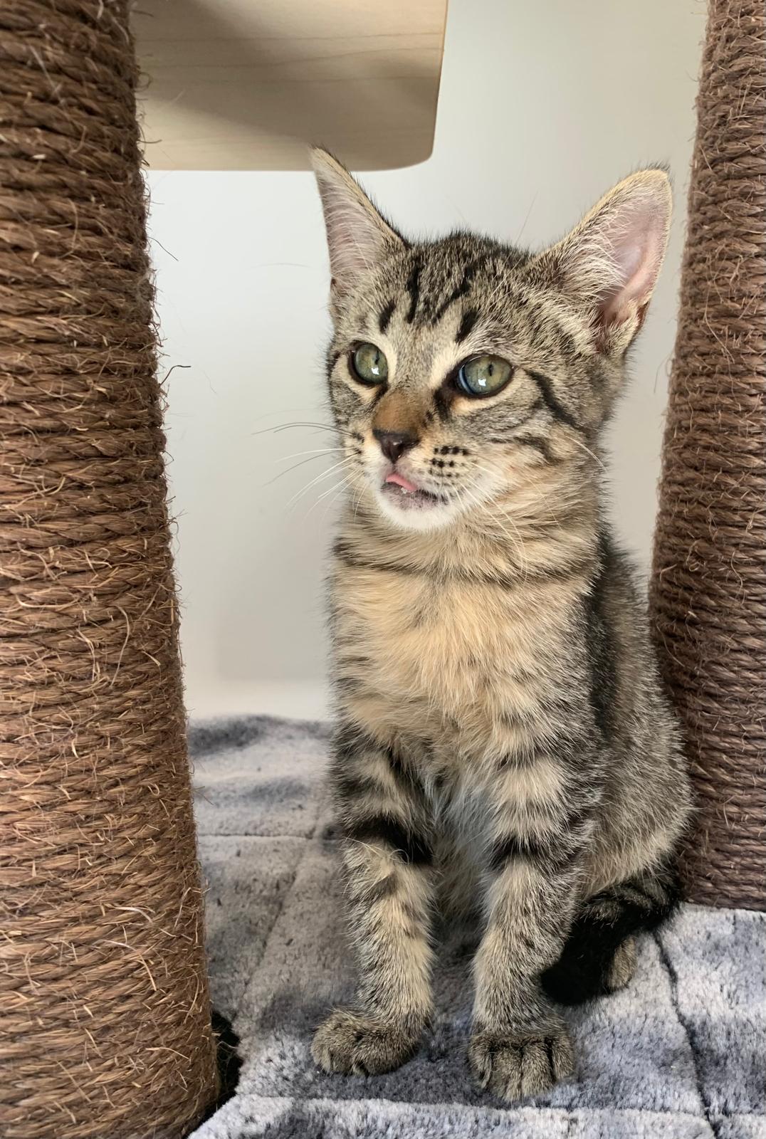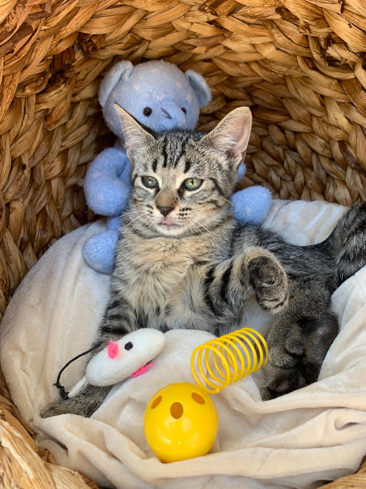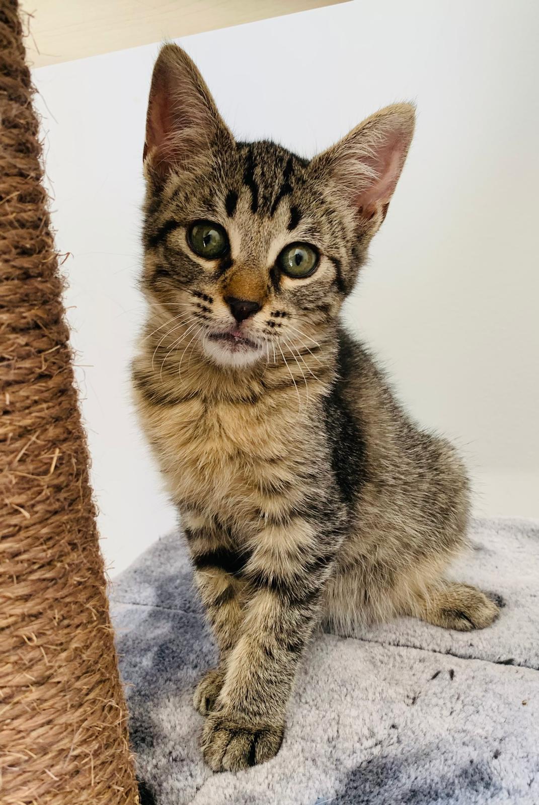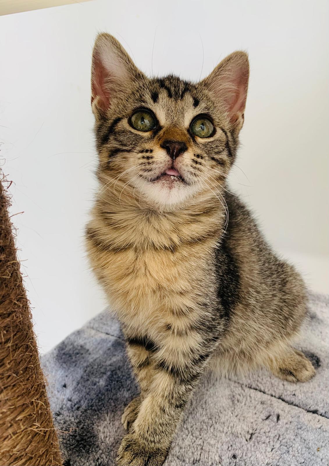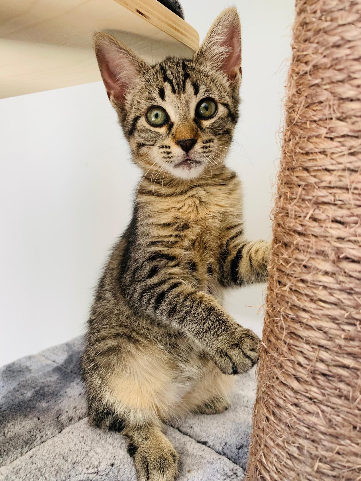 Sienna llegó junto a su madre Lotus y sus hermanitos: Kiran, Tao y Ayla, desde Ceuta, tras ser rescatada de una situación complicada. Con su manto atigrado de líneas definidas en las 4 patitas y con el pecho y finas en tonos beige, marrón y negro, Sienna guarda en su porte la elegancia discreta de quienes observan antes de lanzarse.