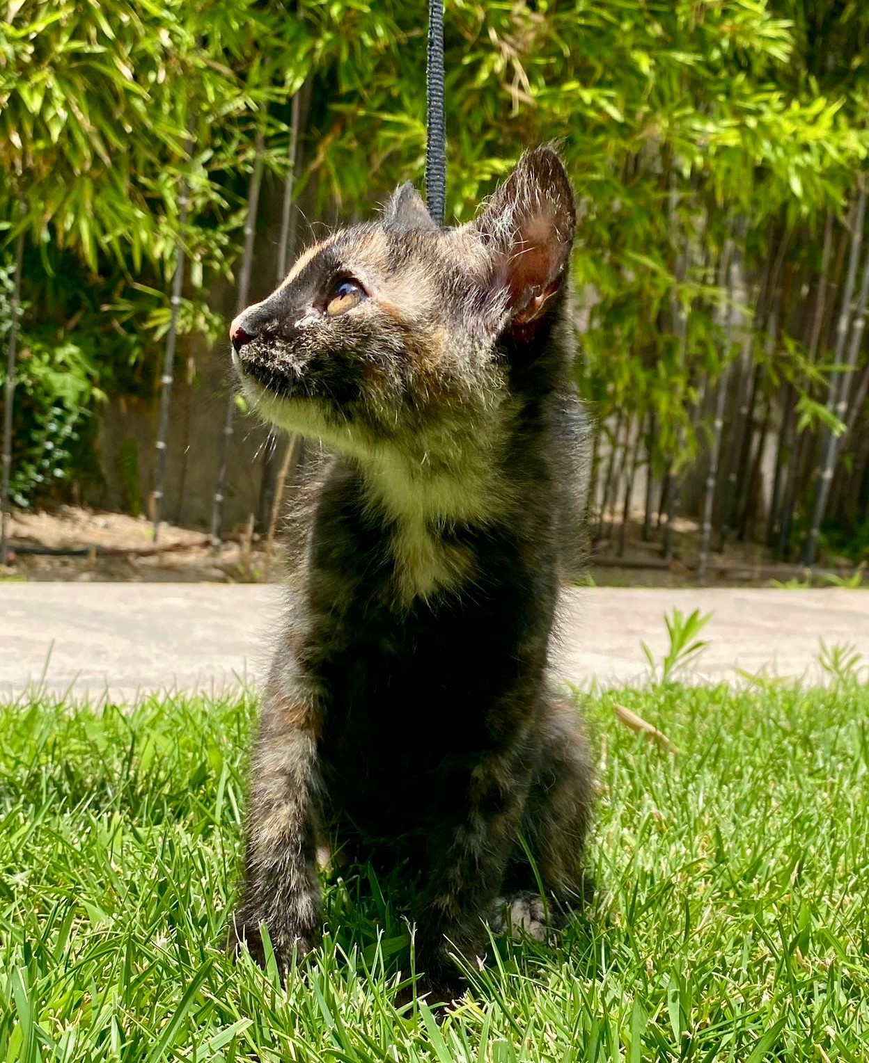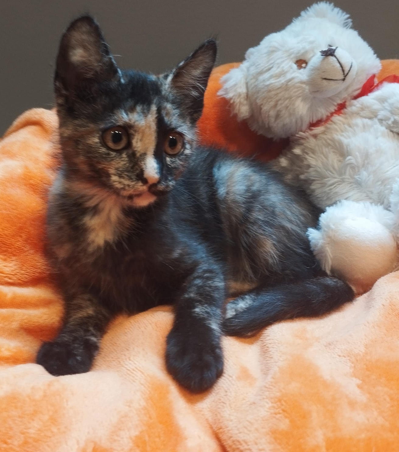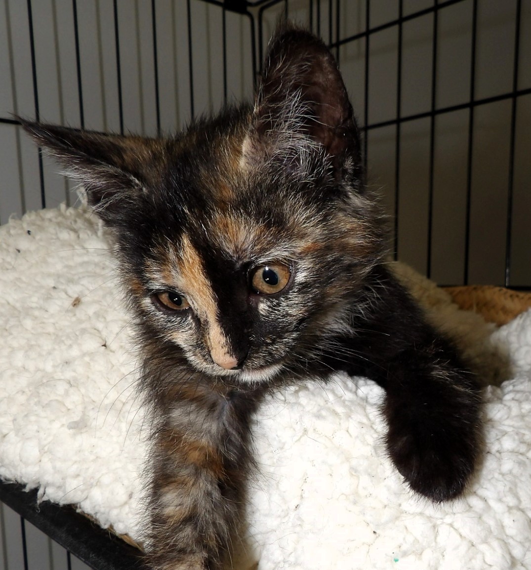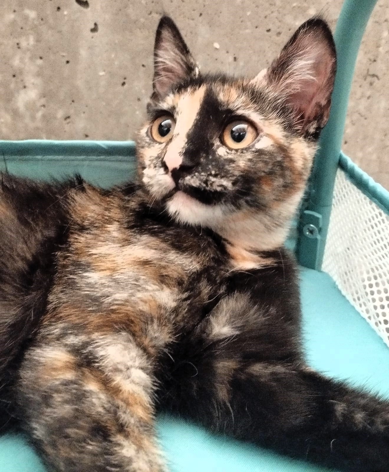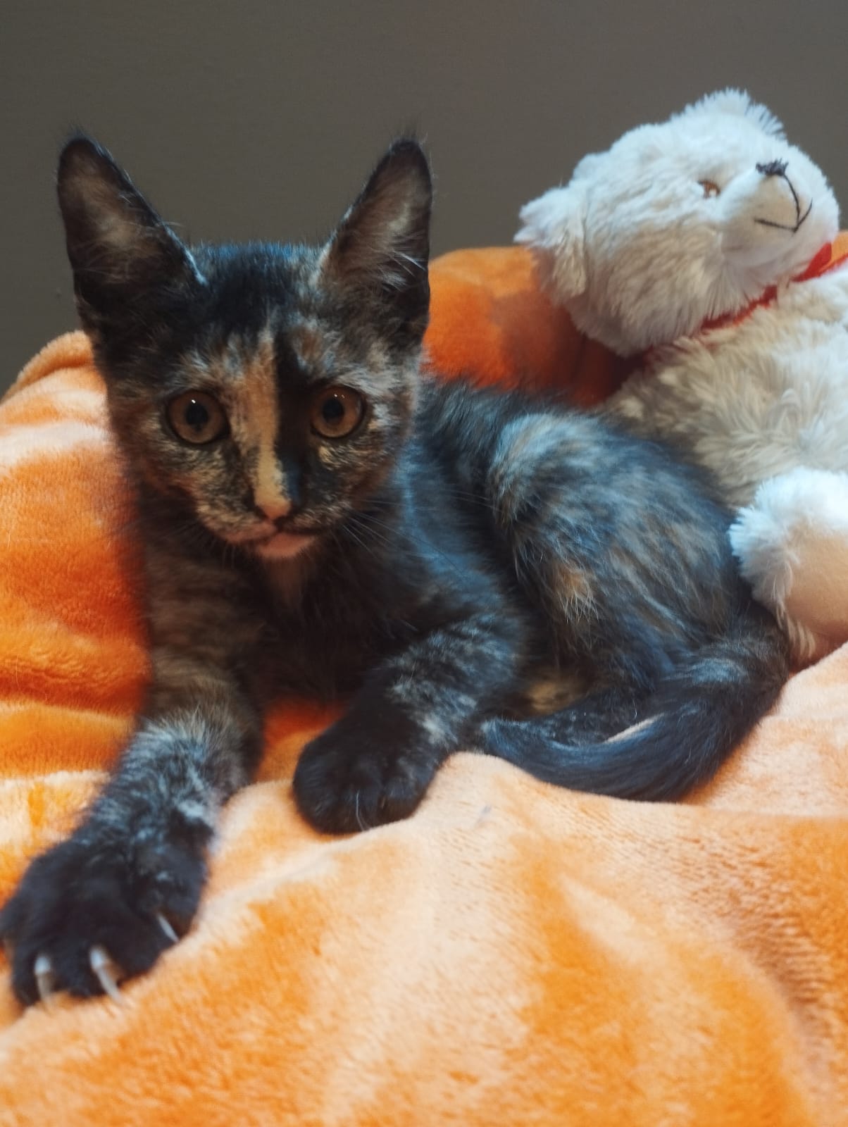 Trufita tiene 6 meses y un hermoso manto carey que resalta su singular belleza y espíritu indomable. Aunque es la más pequeña de las tres, su corazón es enorme, lleno de ternura y ganas de vivir. Trufita es una gatita tranquila y juguetona, disfrutando tanto de los momentos de juego como de la calma que le brinda un rincón acogedor. Aunque es reservada por naturaleza, su mirada siempre atenta revela una mente observadora e inteligente.